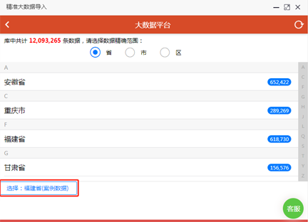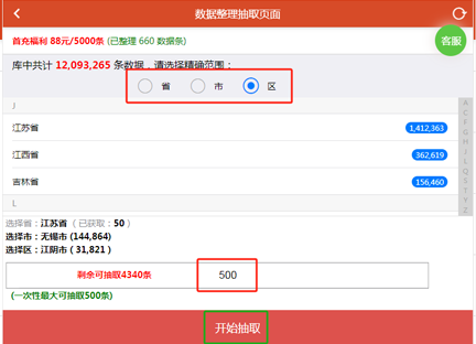 大数据会员中心:选择城市(可定位到区县),点击抽取条数(每次只能抽取500条,不限抽取次数);如下图标红