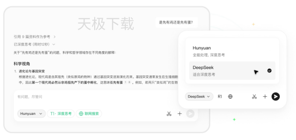 ●深度搜索能力:整合微信公众号、全网资讯及腾讯生态资源。