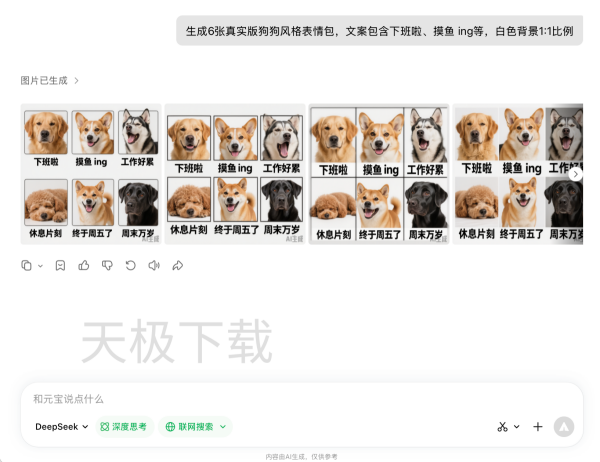 ●表情包组图:输入 “生成6张真实版狗狗风格表情包,文案包含下班啦、摸鱼 ing等,白色背景1:1比例”,系统会自动匹配狗狗动作与可爱字体。
