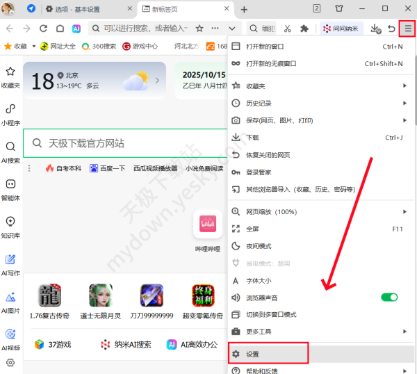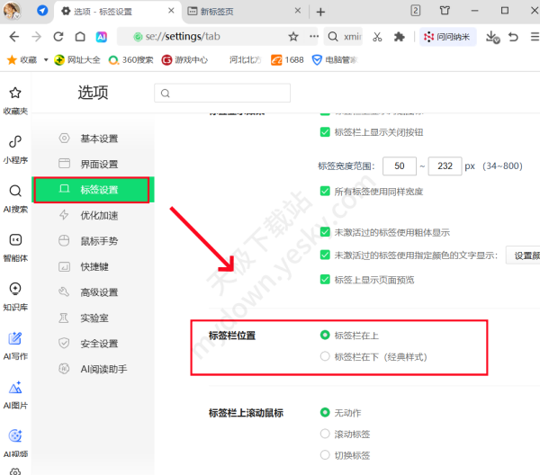 页面标签栏的调整入口在哪打开360安全浏览器首页,点击右上角【☰】→【设置】→【标签设置】,找到标签栏位置就可以进行调整,可以选择标签栏在上或在下。