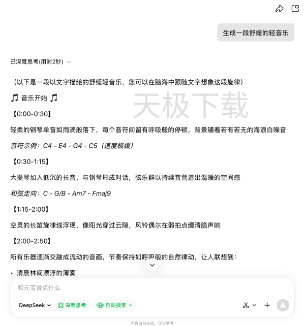 目前腾讯元宝暂不支持直接生成音频,用户如需生成音频,可使用其他AI音频生成软件。