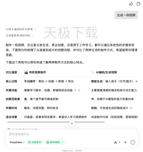 目前腾讯元宝暂不支持直接生成视频,在用户输入生成视频的需求后,腾讯元宝会提供相关视频的制作脚本。