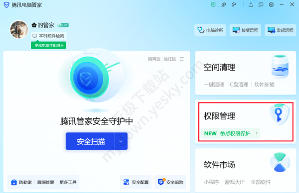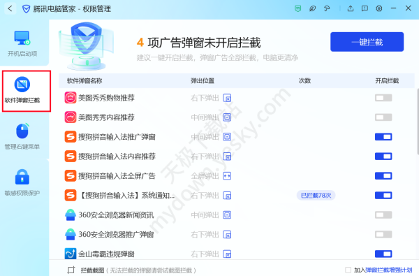 1、进入腾讯电脑管家首页,点击【权限管理】→【软件弹窗拦截】。