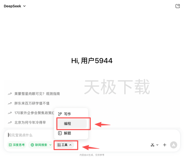 1.打开腾讯元宝,点击【工具】,选择【编程】。