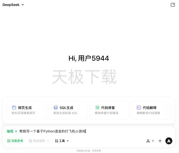 2.输入编程的需求,例如:帮我写一个基于Python语言的打飞机小游戏,按回车键发送。