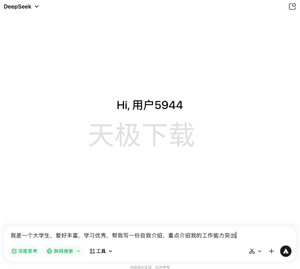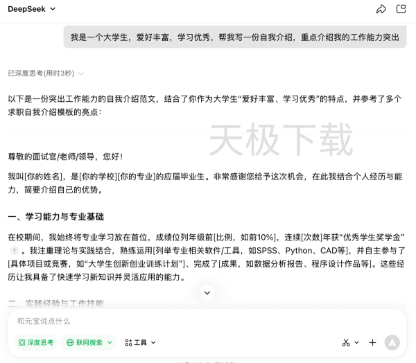 1.打开腾讯元宝,在输入框输入自我介绍要求,例如:我是一个大学生,爱好丰富,学习优秀,帮我写一份自我介绍,重点介绍我的工作能力突出,按回车键发送。