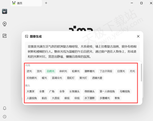 3.如果不知道提示语怎么写,可以简单写图像的主题内容,然后点击【提示词典】,选择光线和镜头,最后点击发送。