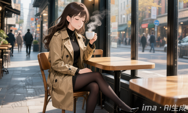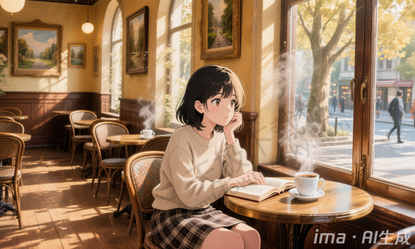 腾讯imaAI图像生成效果展示1.咖啡馆外景职场女性喝咖啡。