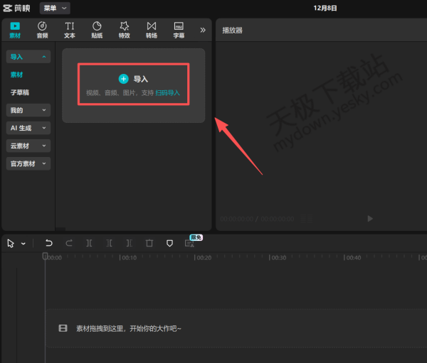 1.下载并打开最新版本的剪映客户端,点击左侧【导入】,添加视频素材。