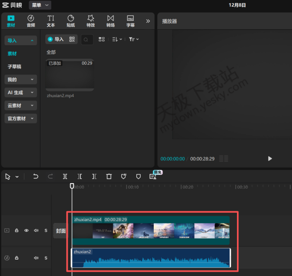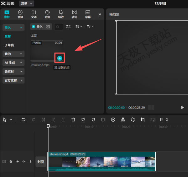 2.点击素材右下角【+】,将视频素材添加至轨道上。
