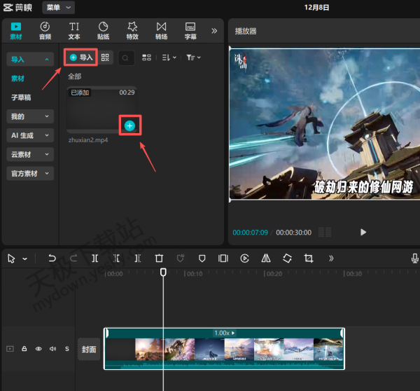 ●下载并打开最新版本的剪映客户端,点击左侧【导入】,上传视频素材,然后将视频素材添加至下方轨道。