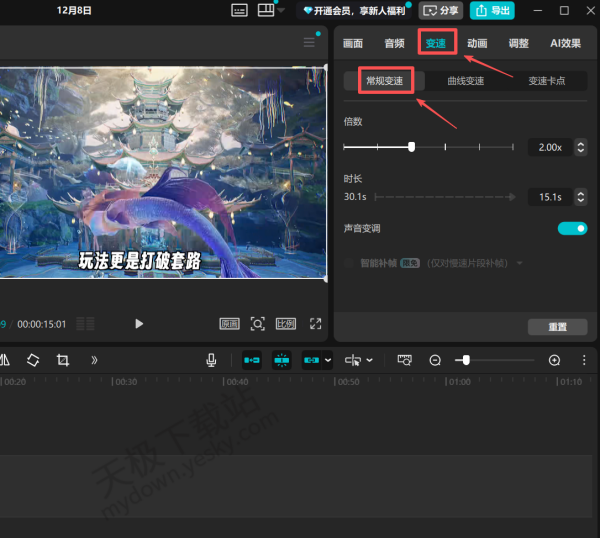 ●选中轨道视频,点击右侧【变速】-【常规变速】,此处可对这个视频进行变速处理。