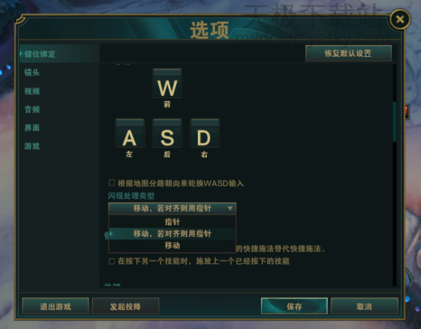 2.如果想要改变上下左右的移动方式,可以在基础设置下方进行更改,此外,为了让召唤师更方便得使用闪现,也有对应的设置可供选择。