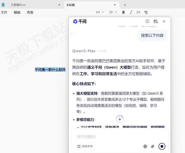 3.然后我们用鼠标指针选中目标文本,点击【AI搜索】,会弹出千问搜索窗口。