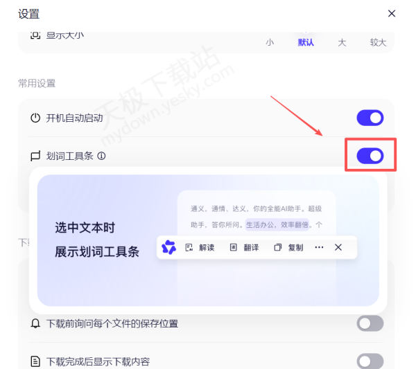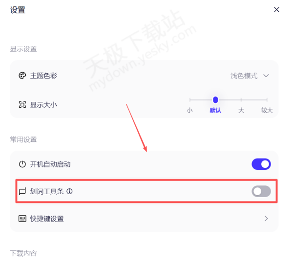2.在设置中找到【划词工具条】,将其打开。
