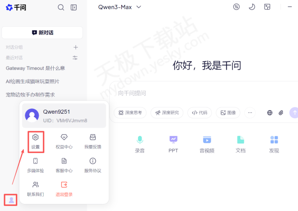1.下载并打开最新版本的千问客户端,点击左下角【头像】,选择【设置】。